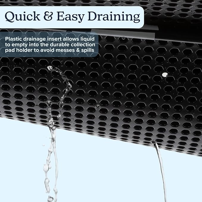 - THREE-LAYER SYSTEM - The artificial dog grass mat sits on top of a secure plastic drainage insert that allows liquid to empty into the durable collection puppy pad holder to avoid messes and spills.