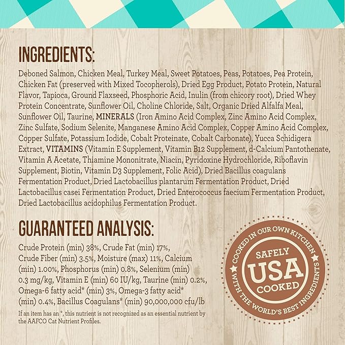 - Salmon cat food crafted with real whole foods, like sweet potatoes, for easily digestible carbohydrates