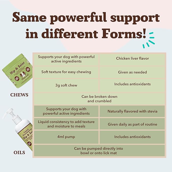 - Promote Mobility and Joint Wellness: Our hip and joint supplement is expertly formulated to support overall joint health and mobility. With the power of Glucosamine and Chondroitin Sulfate, it may help with stiffness, and swelling, while promoting healthy fluid retention. Additionally, the inclusion of Manganese, Hyaluronic Acid, and MSM may help your dogs ligaments, maintain joint lubrication, and attend to swelling for better movement