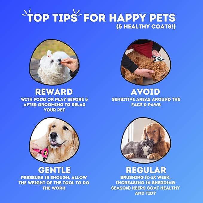 - MULTIPLE BENEFITS: Our dog and cat brush for shedding removes loose hairs and lightly thins the coat without causing discomfort. This improves the health and appearance of your pet's coat, relieves stress, stimulates blood circulation, and helps you to keep your home fur-free too!