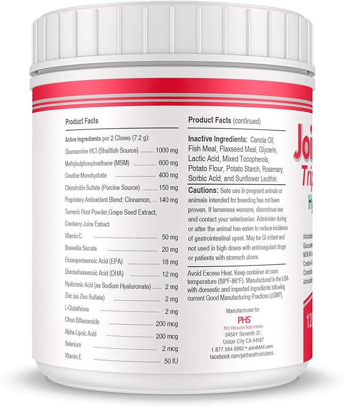 - Comprehensive Support: Joint MAX Triple Strength Soft Chews not only target joint health but also provide additional benefits for overall wellness. They contain antioxidants, vitamins, and minerals that support the immune system, promote healthy coat and skin, and contribute to overall pet well-being.