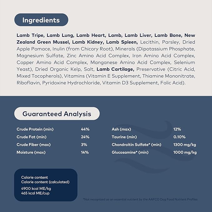 - HIGH PROTEIN, NUTRIENT DENSE: Featuring free-range Lamb, Organs with extra Tripe to support digestion, Bone, and New Zealand Green Mussels, this grain-free dog food delivers nutrition with a mouth-watering taste for all dogs. Gentle air dried processing retains the goodness of the raw ingredients. This food offers stimulating crunchy texture small enough for puppy food but soft enough for senior dog food.