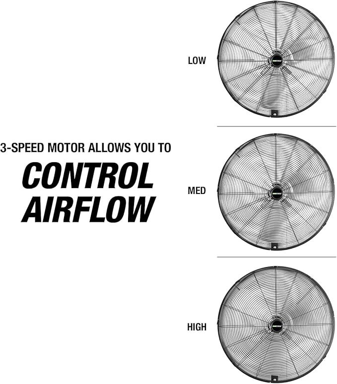 - Adjustable Speed: Customize the cooling experience with a 3-speed garage fan motor that allows you to control airflow volume. Adjust outdoor fans settings to meet your cooling needs, whether for light air circulation or maximum airflow in larger spaces.