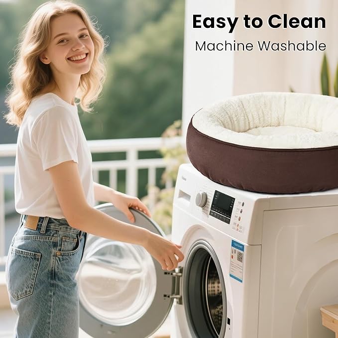 - DONUT CUDDLER SHAPE: The round dog bed allows pets to curl up while the raised rim creates a sense of security and provides head and neck support. Premium ultra-soft filling offers joint and muscle pain relief.The 20 inch round pet bed is perfect for cats, small dogs and other pets up to 15 lbs.