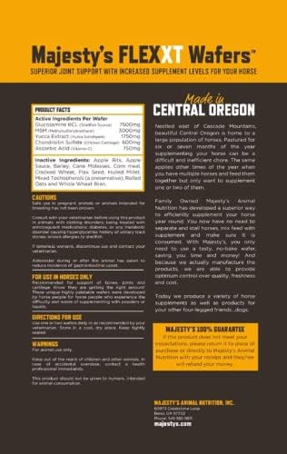- FOUR MONTH SUPPLY - Each bag contains 60 wafers. As per directions, one bag of Majasty's Flex XT Wafers will provide your horse with the care and nutrients they deserve for two months.