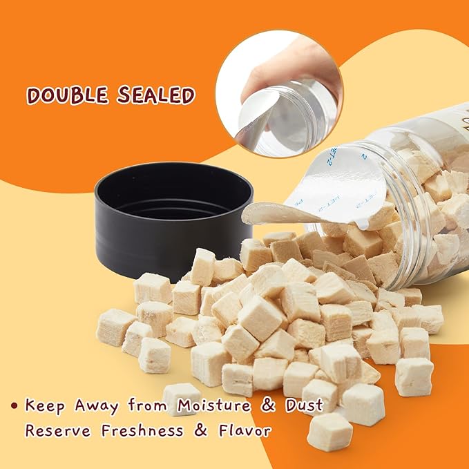 - EASY TO STORE & CARRY: Freeze-dried chicken cubes are packaged in a double sealed jar, which is easy to carry when going out