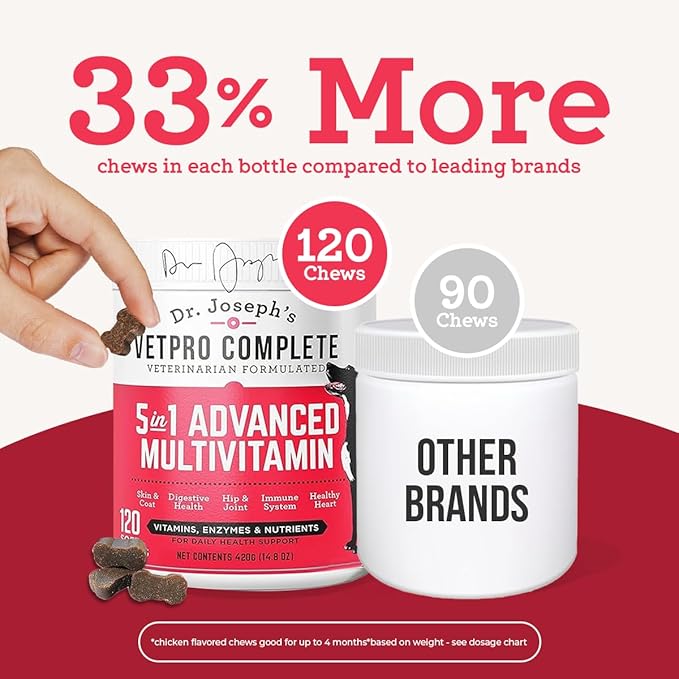 Dr. Joseph's VetPro Complete Multivitamin Dog Supplement, 120 Count (Large Dog 60 Day Supply), 5in1 Chew with Vitamins, Enzymes & Nutrients, Hip & Joint Health, Immune System & Allergy Support