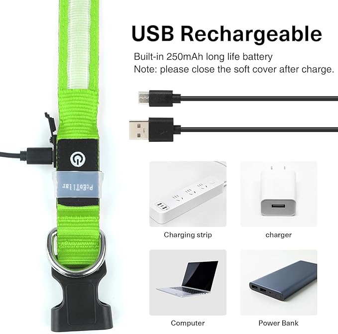 - Rechargeable Led Dog Collar: PcEoTllar dog collar is waterproof. No worries about the collar when your dog is swimming or playing under the water! Please close the Soft Charging Cover after charging and please stay away from sea-water. Rechargeable with any other daily USB device is more convenient, you will not paying for batteries anymore! Full power can last 10 hours.