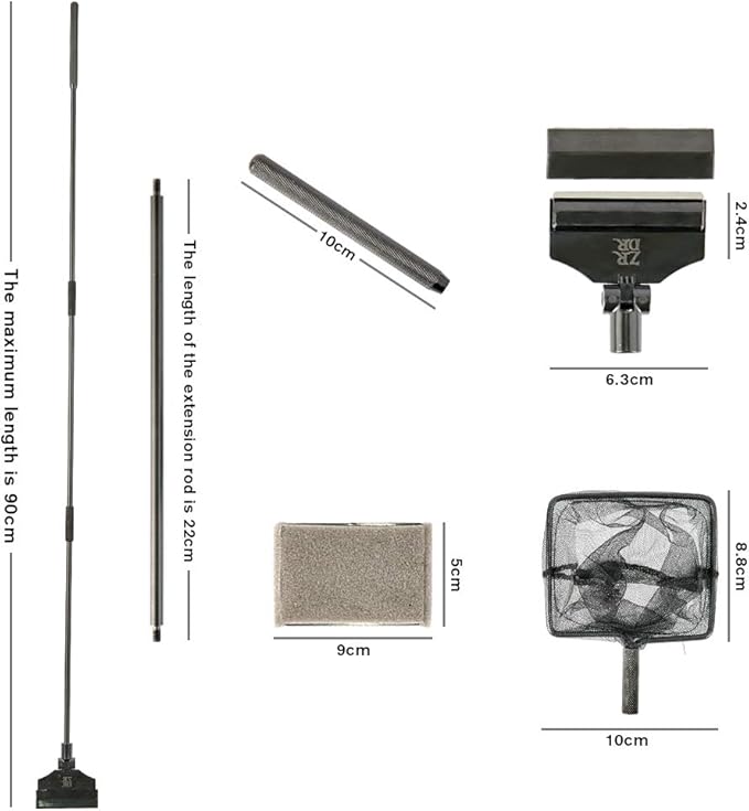 ZRDR Stainless Steel Algae Scraper Aquarium Cleaning Tool for Glass Aquariums, Including Algae Scraper, Sponge Pad, Fish Net, Cleaning Brush, Adjustable Length, Durable, Does Not Hurt The Fish Tank