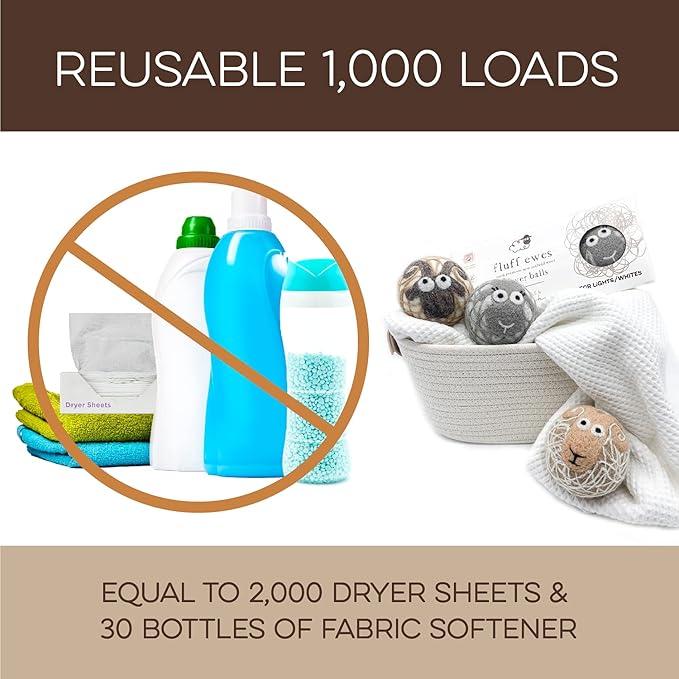 - REUSABLE FOR 1000+ LOADS – REDUCE WASTE: Why keep buying disposable dryer sheets? These cute dryer balls last 1000+ loads, replacing 2000 dryer sheets or 30 bottles of fabric softener. Fluff Ewes dryer wool balls laundry reusable deliver a cost-effective solution for 2-4 years of hassle-free laundry. Make a smarter choice for your wallet and the environment.