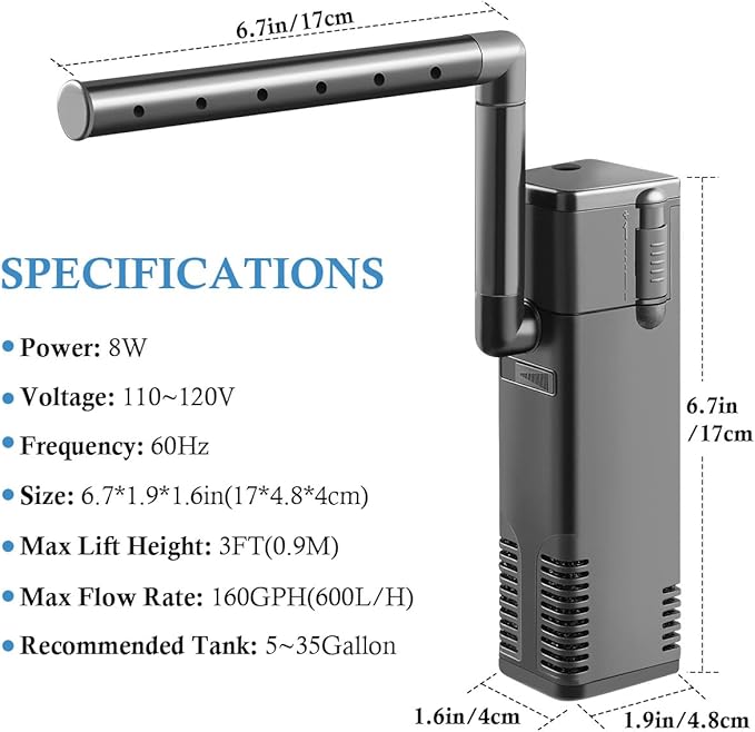 - [Powerful Internal Filter] Max water flow rate: 160GPH(600L/H), Dimensions: 6.7*1.9*1.6in(17*4.8*4cm), 8 watts filter suitable for 5-35 gallon fish tank. Water flow can be adjusted according to your own needs.