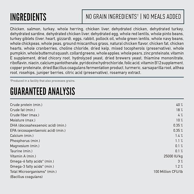 - First five ingredients are fresh or raw*, including chicken, wild-caught salmon and rabbit, and responsibly farmed pollock oil offers increased levels of Omega 3s, EPA and DHA