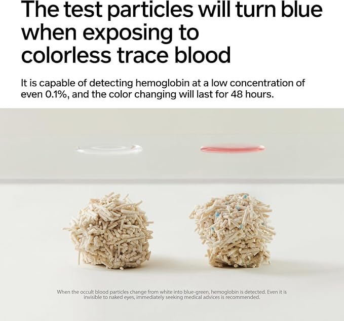 - 【Attention】 1.Direct exposure to hard light or friction with metal would invalid the detection function of the occult blood test particles. Please avoid such situations.2.Mineral substance contained in bentonite would affect the detection performance. Do NOT mix the product with other cat litter. 3.The vacuum design is only to facilitate its transportation and storage, and air leakage does NOT compromise the use. If you DO mind, please contact us.