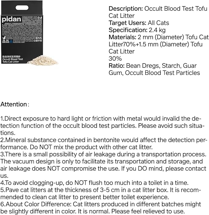 - 【Attention】 1.Direct exposure to hard light or friction with metal would invalid the detection function of the occult blood test particles. Please avoid such situations.2.Mineral substance contained in bentonite would affect the detection performance. Do NOT mix the product with other cat litter. 3.The vacuum design is only to facilitate its transportation and storage, and air leakage does NOT compromise the use. If you DO mind, please contact us.