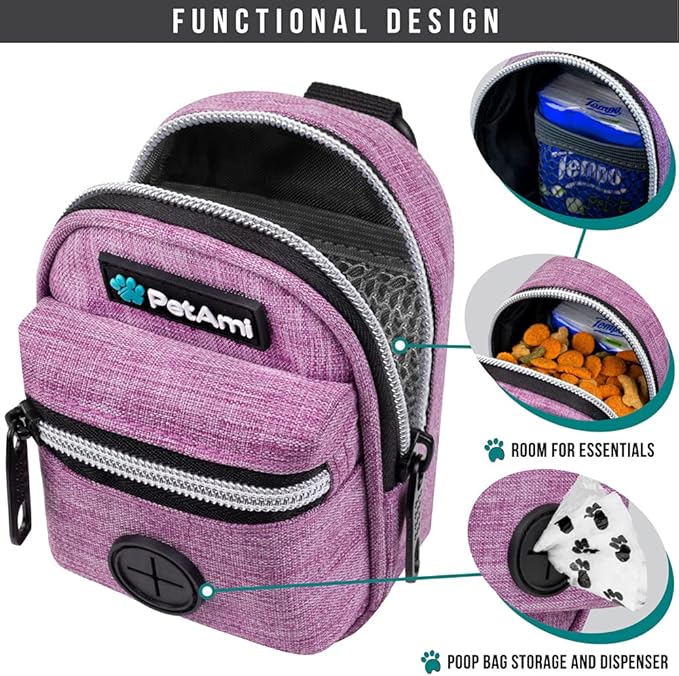 - PURPLE DOG WALKING BAG: PetAmi poop bag holder dispenser includes one roll of dog poop bags, measures 4.7 x 1.8 x 3 inches, and is made of durable oxford polyester. Cute mini backpack doggy trash bag carrier is refillable and is compatible with most dog poop bag rolls. This pet travel bag is a great gift for dog mom, dad, parents, owners and trainers. Comes in multiple colors to mix and match your dog leash.