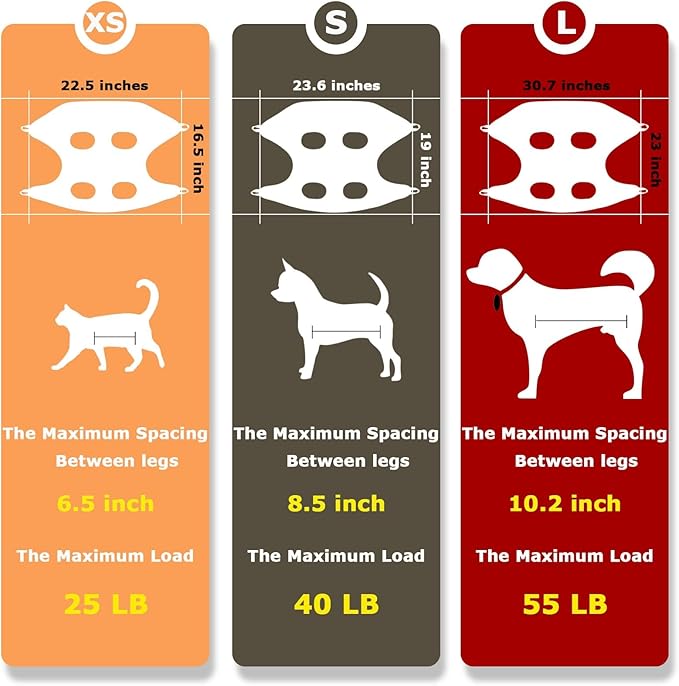 - 【Size Tip】Size S is suitable for pets with about 8.5 inches between the front and rear legs,In order to make your pet fit perfectly with the grooming hammock, please measure the distance between your pet's legs before purchasing, and the maximum load weight is 40 lbs