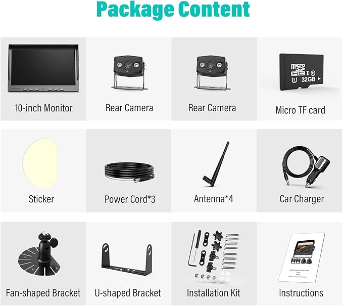 - 🚚🚚 Upgraded Wireless Signal System: This wireless back up camera system includes a 10 inch monitor and 2 wireless backup cameras. Adopts 2.4G wireless digital transmission and upgraded digital signal chip, it presents stable high-definition 1080P images/videos for reversing or monitoring.