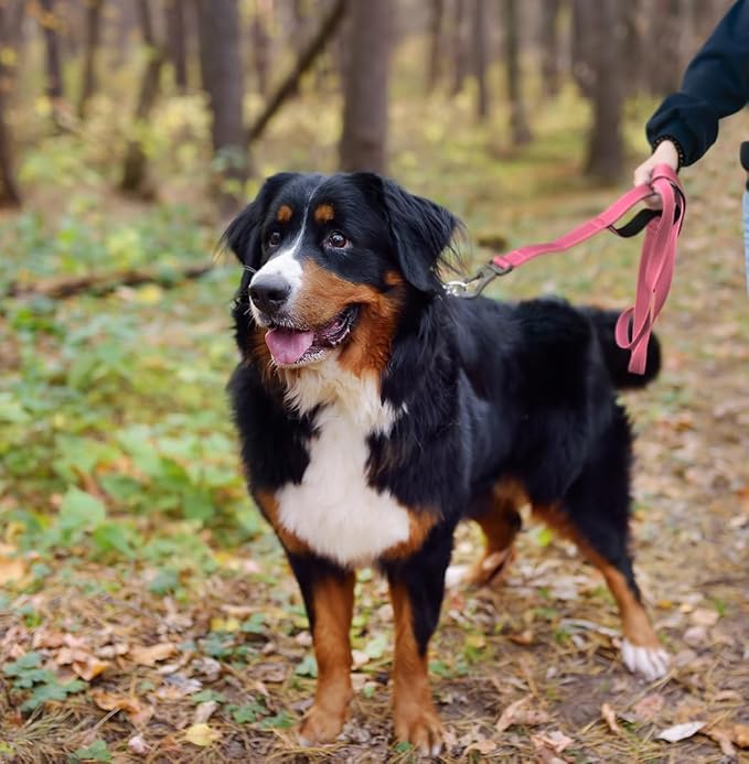 - 【SOFT PADDED DUAL HANDLES】5FT ideal length, 1 inch width leash for medium dogs, Comfortable Padded handles protect your hand without rope burn. Extra Handle for traffic control. Pink dog leash is perfect for outdoor activities, running, walking or training.