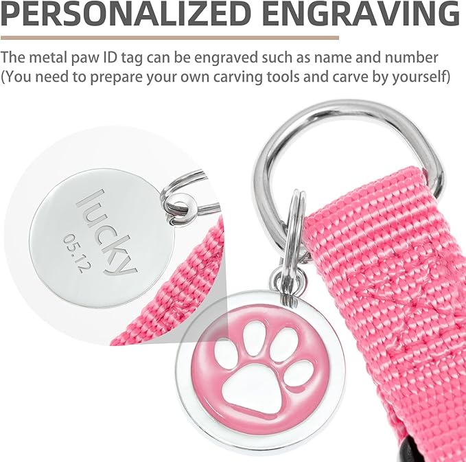 - [Cute ID Tag for DIY] - Each harness is equipped with a metal ID tag, and the front is a cute paw pattern, while on the back, you can engrave whatever you want, such as the dog's name and so on. It does not corrode as easily as wooden labels and is durable. You can also remove it when washing the harness.