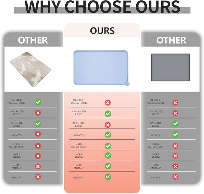 • Various sizes available: our pet mats come in 5 different sizes - 18.5" x 11.5", 22" x 14", 24" x 16", 28" x 18", and 32" x 24". Suitable for all kinds of pets, from puppies to large pets, choose the perfect size for your furry friends and avoid messy spills at mealtime