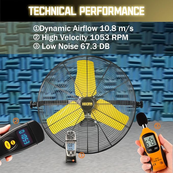 - 【Low Noise】: HICFM’s new technology contributes high velocity airflow up to 10.8 m/s yet low noise in this wall mounted fan black. 2-Speed adjustable with pull chain control featuring three different speeds. In high speed running, noise is only 67 dB on 3 ft, and 60 dB on 6 ft away from the fan, less noisy than other fan