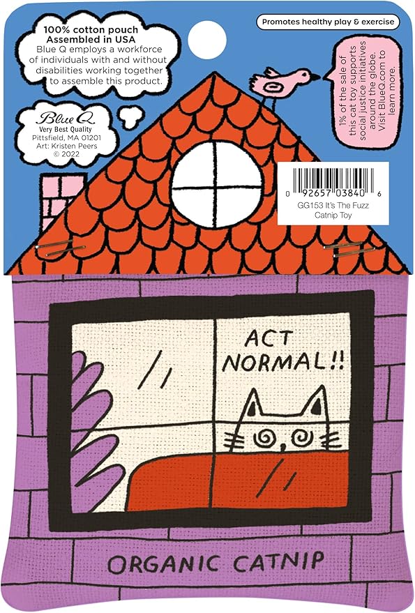 - 100% Serious Too: Fun and funny for sure, but Blue Q catnip cat toys are also top quality and feature US-grown, organic, leaf-cut, fancy catnip and not the traditional cheapo ground up stuff you find in most cat toys. The 100% cotton pouches are silk-screened by hand. They promote healthy play and exercise blah blah blah, but more importantly, hours and hours of kitty fun! We're cat crazy too and wouldn't have it any other way.