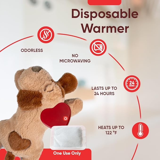 - Safe & Easy to Use – Includes a battery-operated heartbeat unit with an on/off switch (2 AAA batteries not included). and a non-toxic, 24-hour disposable heat pack (2 AAA batteries not included). Easy Care - When your puppy has covered their plush toy with their love and slobber, just toss it in the wash! This adorable toy is machine washable on the gentle cycle, just don’t forget to remove the heartbeat unit and heating pack.