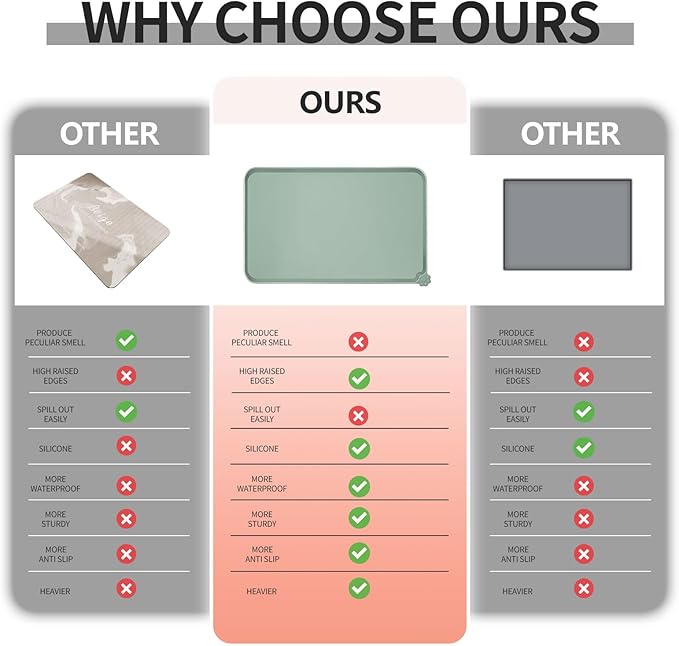 • Various sizes available: our pet mats come in 5 different sizes - 18.5" x 11.5", 22" x 14", 24" x 16", 28" x 18", and 32" x 24". Suitable for all kinds of pets, from puppies to large pets, choose the perfect size for your furry friends and avoid messy spills at mealtime