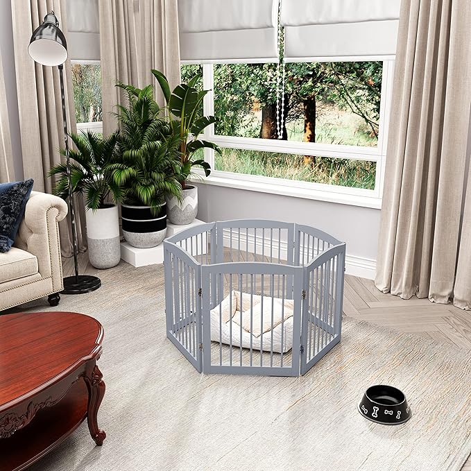 - 【NO ASSEMBLY REQUIRED】: The free standing dog gate is fully assembled and ready to use! Unfold the indoor dog fence and place it anywhere as a pet fence, room divider. Moreover, don't worry about the floor being scratched as the Non-slip rubber pads keep protecting your floor.