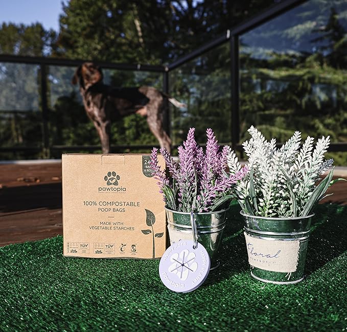 - Purely compostable dog poop bag (240 bags, Lavender bag carrier): Pawtopia supports sustainable living and does not harm the environment. Our biodegradable dog poop bags, made with vegetable starches (corn starch), are 100% home compostable and break down into natural substances such as water, Co2, and biomass. Our biodegradable poop bags are certified with OK Compost Industrial under EN 13432 (equivalent to ASTM6400), and OK Compost Home by Tüv Austria under AS5810/ NF T51800.