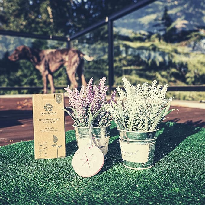 - Purely compostable dog poop bag (60 bags, pink bag carrier): Pawtopia supports sustainable living and does not harm the environment (unlike plastic bags). Our biodegradable dog poop bags, made with vegetable starches (corn starch), are 100% home compostable and break down into natural substances such as water, Co2, and biomass. Our biodegradable poop bags are certified with OK Compost Industrial under EN 13432 (equivalent to ASTM6400), and OK Compost Home by Tüv Austria under AS5810/ NF T51800.