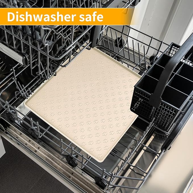 Ptlom Pet Placemat for Dog and Cat, Waterproof Non-Slip Silicone Feeding Bowl Mat Prevent Food and Water Overflow, Puppy Dish Feeder Fountain Trays Suitable for Medium and Small Pets, Beige