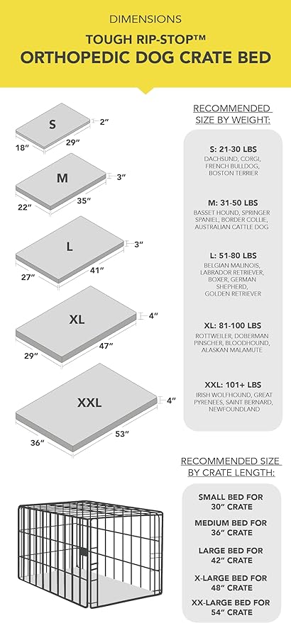 - Orthopedic Support: The solid foam mattress provides dense, firm support for your dog's joints, hips, and spine for optimal comfort in the crate. Unlike egg crate foam and other cheap, flimsy mattresses, our orthopedic crate beds don't lose support or flatten over time, even for the biggest and heaviest of breeds. Mattress thickness varies by bed size, ensuring the perfect balance between comfort and firmness for every dog breed.