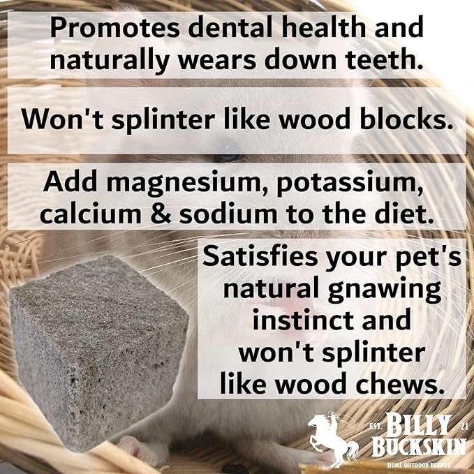 - INTERACTIVE CHEW TOYS FOR ENRICHING PLAYTIME - Billy Buckskin Chinchilla Pumice Chew Blocks are the perfect addition to your small petsβ habitat, offering engaging, in-cage entertainment for rabbits, bunnies, guinea pigs, hamsters, rats, and chinchillas. These natural pumice blocks encourage healthy chewing, interactive play, and physical activityβhelping to reduce boredom, support dental health, and minimize damage to cage accessories. Whether pushed, chewed, or explored, they provide safe, enriching fun that keeps your furry companions active, stimulated, and happy.