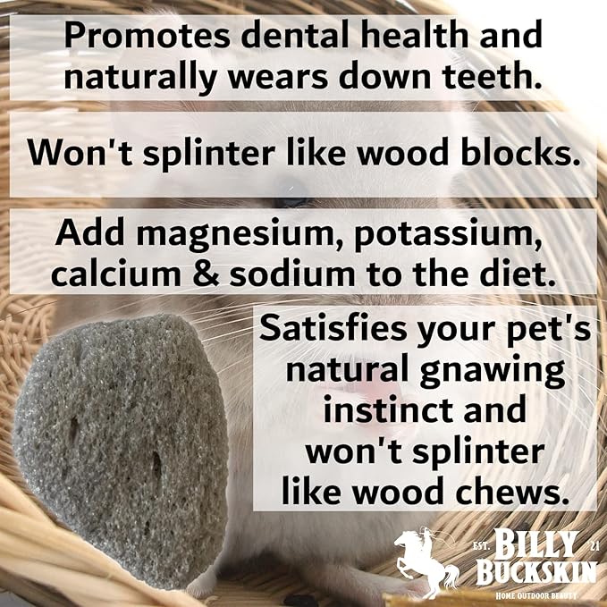 - NATURAL CHEW TREATS WITH NUTRIENTIONAL BENEFITS - Billy Buckskin Pumice Rabbit Treats are more than just engaging chew toysβthey naturally support dental health and offer trace mineral benefits for rabbits, guinea pigs, hamsters, chinchillas, and other small pets. Ideal for daily cage enrichment, these nutrient-rich pumice stones help wear down teeth safely while promoting activity and overall well-being.
