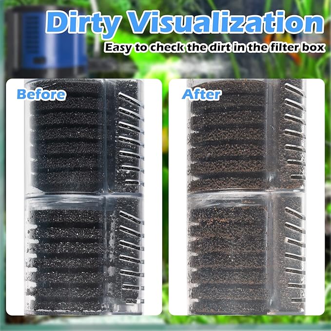 - DIRTY VISIBLE - The transparent box design of this fish tank filter allows the black filter sponge to be visible when it attracts dirt. It is easier to check if the fish tank filter needs to be cleaned. Easy to clean.