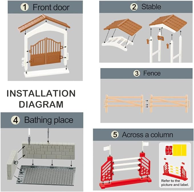 - Safe Material : Safe First!Horse stable playset are made of environmental PVC, non-toxic, durable and washable. ASTM/EN71/CPSIA approved. Suitable for children aged 3-12. Warm Tips - Include SMALL pieces, kids under 3 please play under adult supervision.