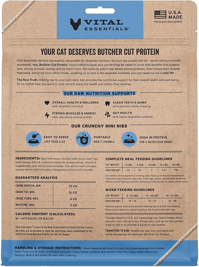 - CRUNCHY FREEZE-DRIED RAW BEEF & CHICKEN CAT FOOD: Vital Essentials Crunchy Freeze Dried Cat Food packs more protein than industry standard into every bite to deliver the peak vitality your cat deserves, especially when compared to dehydrated cat food. This complete and balanced freeze-dried raw cat food is made with premium butcher cut beef & chicken, responsibly sourced in the USA.