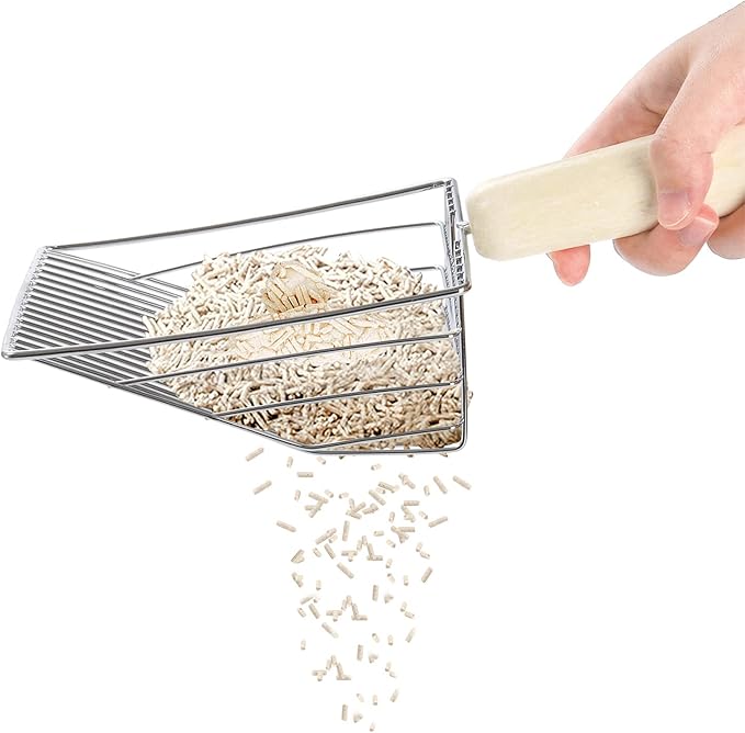 - DURABLE MATERIAL - Our kitty litter scooper is made of high-quality metal that are built to last. The metal construction ensures that it won't rust and can withstand all kinds of bumps. The base is made of selected ABS material, which is durable, wear-resistant, and not afraid of damage. And the solid wood handle adds a touch of warmth and comfort to the design.