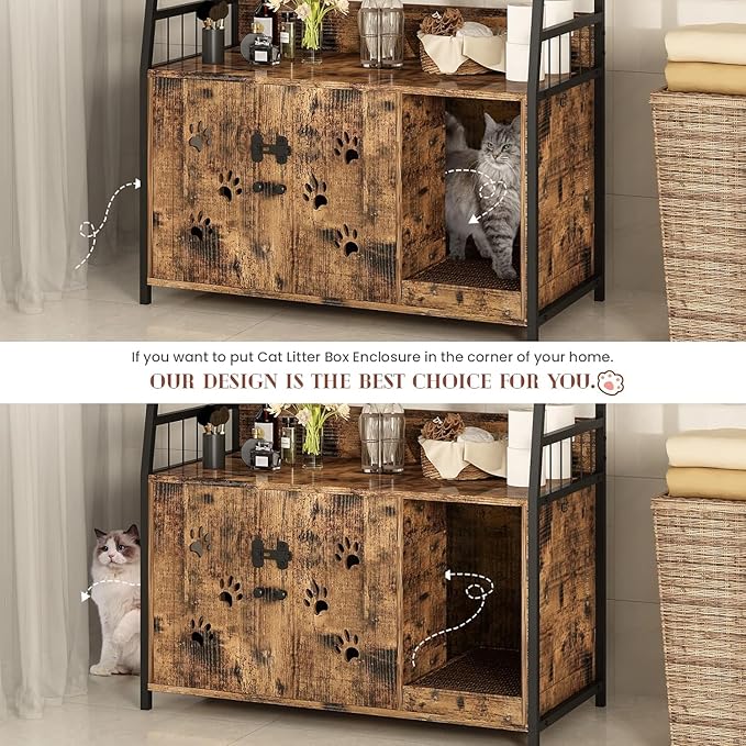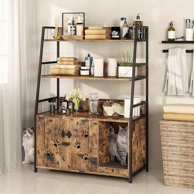 - Stylish and Multi-Purpose Cat Litter Box House: It's a modern and stylish design with more than one function! Besides being used as a cat litter box enclosure it can also be used as a shelf and storage cabinet, saving you a lot of space and budget. The cat cabinet bottom is ideal for litter boxes, and the cat claw board at the entrance and exit can let the booty on the cat's claw fall directly into the gap of the scratch board, and will not be dragged out to stain your floor. While the top two shelves organize your various items while saving more space in your house. The cat litter box enclosure on the outside of the hooks helps you store your cat litter shovel.