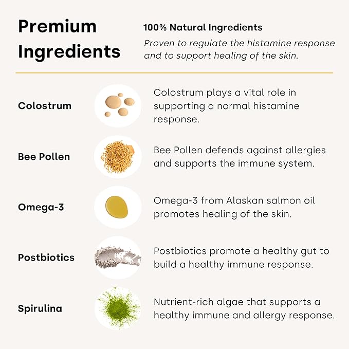 - Science backed Itching Relief For Dogs - When it comes ot your dog's itchy skin, more nutrients are better. Led with colostrum and spirulina, two powerful nutrients for histamine response.