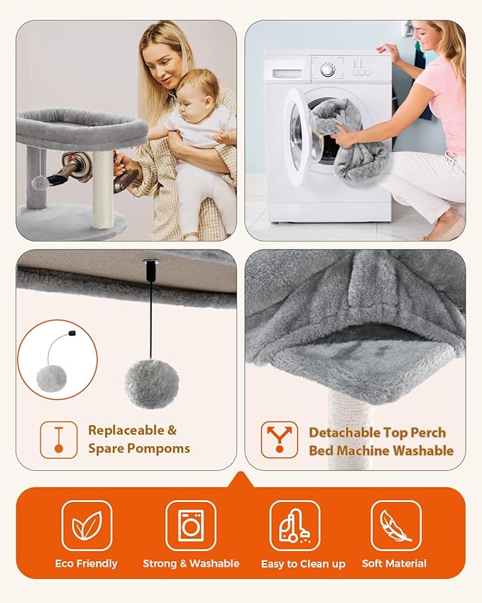 - Instincts Releasing Center: Natural instincts of climbing and hunting are satisfied on this cat tower tree. The top perch includes a removable cat perch cover for easily cleaning and safety while lying tall on the cat tower,and a replaceable dangling ball toy to keep your cat mentally stimulated and entertained