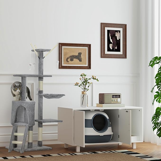 - Easy Access: A large front door helps kitty get in and out. It has a grate down below, preventing cats from spreading litter outside the box when they walk out.