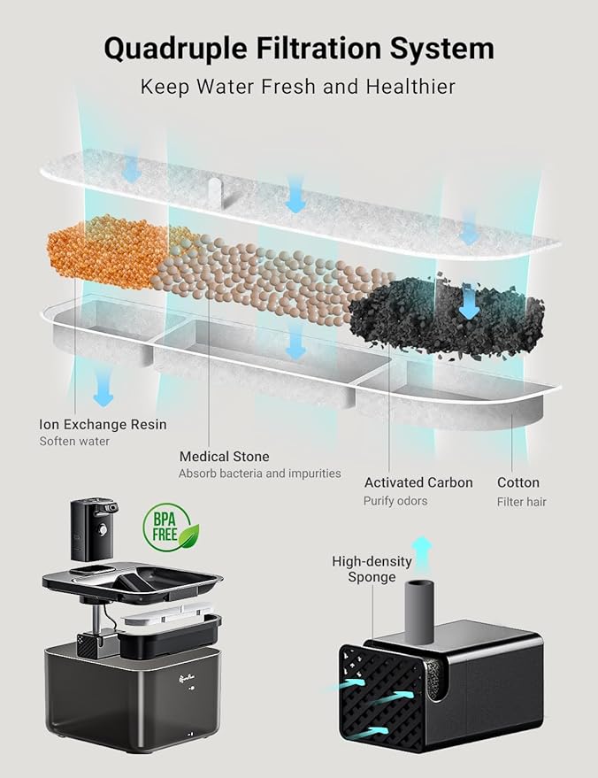 - Enjoy Every Sip of Fresh Water - The 5-level filtration system continuously provides fresh and healthy water to your pets. 1.Activated carbon removes bad taste and odor 2.Ion exchange resin could soften the tap water 3.Medical stone removes heavy metals and releases trace elements 4.Non-woven fabric could filter hair and impurities 5.The high-density sponge of pump helps remove fine particles