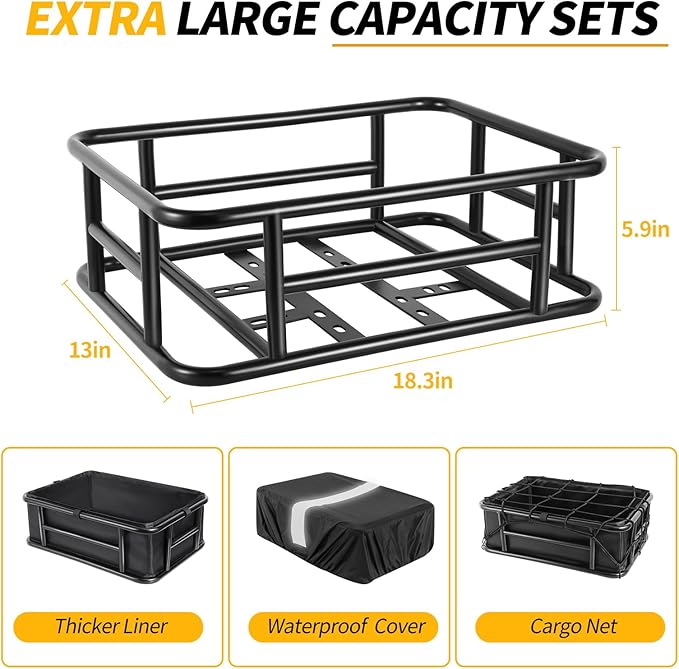 - HEAVY LOADING CAPACITY:Our rear bike basket are the most loaded basket on the market!Thanks to the high quality material,Our bike basket can be loaded over 100 lbs.It adds a lot space when you're going on a bike trip or to the store for carrying groceries