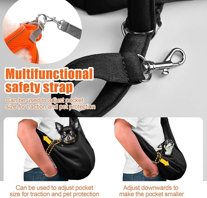 - Sufficient Safety: pets can be easily put into TOMKAS small dog carrier sling after a brief acclimation. You just put your dog in it, attach the safety buckle to the leash buckle on the vest or harness. If your pet wants to jump out of the pouch, the safety belt will stop it from this dangerous behavior and keep your puppy safe. TOMKAS small dog sling is very reliable in terms of safety.Remember, never tie the safety buckle to the collar, it could hurt the dog's neck if it jumps out.