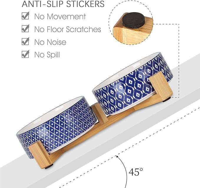 - DOUBLE BOWLS, DELICATE DESIGN - The thoughtful design of these double bowls offers convenience for your pets. You can use one bowl for food and another one for water, raising the dishes closer to your pet for more comfortable eating. Decorated with blue flowers and geometric patterns, these make them more unique that fit perfectly with any home decor style.
