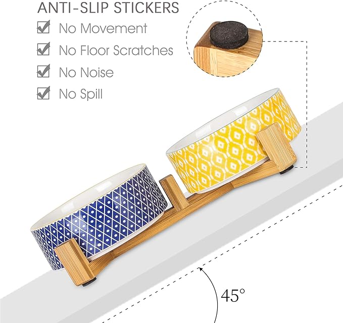 - DOUBLE BOWLS, DELICATE DESIGN - The thoughtful design of these double bowls offers convenience for your pets. You can use one bowl for food and another one for water, raising the dishes closer to your pet for more comfortable eating. Decorated with colored flowers and geometric patterns, these make them more unique that fit perfectly with any home decor style.