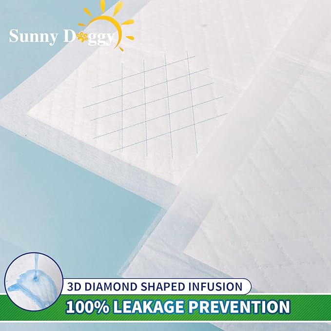 - SUPER ABSORBENT & QUICKLY DRYING: Our heavy duty dog pee pads absorb liquids quickly and efficiently, up to 20 times their own weight. And these pee pads lock in moisture and odors securely. The special diamond-shaped surface guides liquid penetration and reduces spillage.