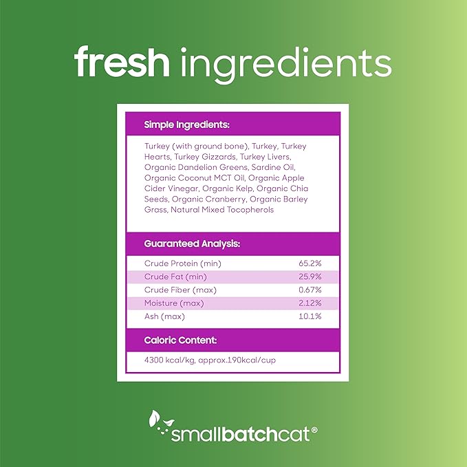 - Rich Protein Raw Turkey Recipe: This freeze dried food for cats is made with 98% meat, organs, and bones, providing a protein-rich option crafted for carnivores and suitable for all life stages.